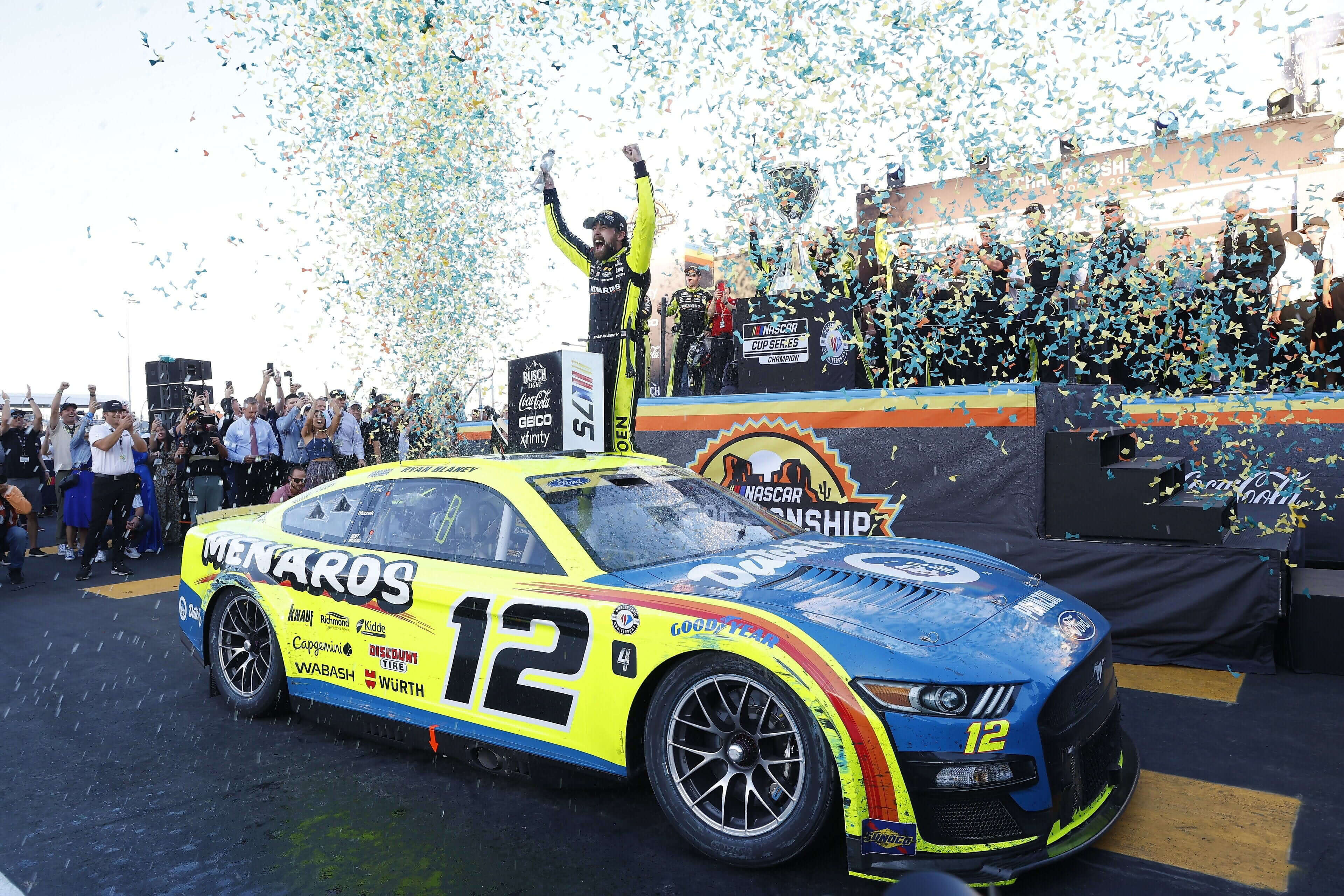 2023 年是 Team Penske 又一个令人震惊的赛季,他们连续第二年夺得 NASCAR 杯系列赛冠军。由Ryan Blaney驾驶的 12 号福特野马在夏洛特、塔拉迪加和马丁斯维尔取得了胜利,4 次进入前 5 名,6 次进入前 10 名。Blaney 进入了季后赛,在激烈的积分争夺中,首次进入冠军四强。凭借力量和精准度,他以 2023 年 NASCAR 杯系列赛冠军的身份结束了他令人难以置信的赛季!